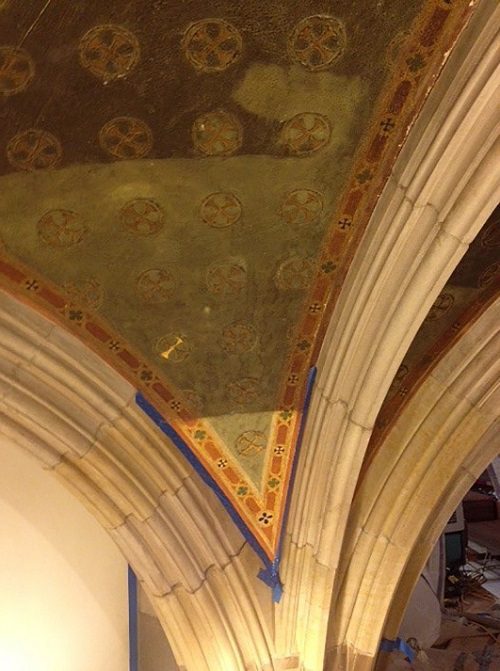 During our work at Yale University, the Roger’s specifications provided how the finishes should be cleaned, but the cleaning materials and methods specified was unsuccessful. This led to John Canning & Co. developing a more effective method that would remove the dirt without damaging the original finishes. As we often need to do when it comes to conservation cleaning, we developed a customized unique aqueous cleaning solution to unlock and solubilize the dirt painted texture surfaces. This cleaning agent formula is only known by John Canning and David Riccio. Depending on the textures, we would use the solution in a gel form or a poultice to get the best results. Over the almost 50 years working in the preservation field and at the many dozens of projects at Yale University, John Canning & Co. has become an expert in the finishes and techniques of James Gamble Roger and what is required to conserve, repair and restore his unique aged effect finishes.